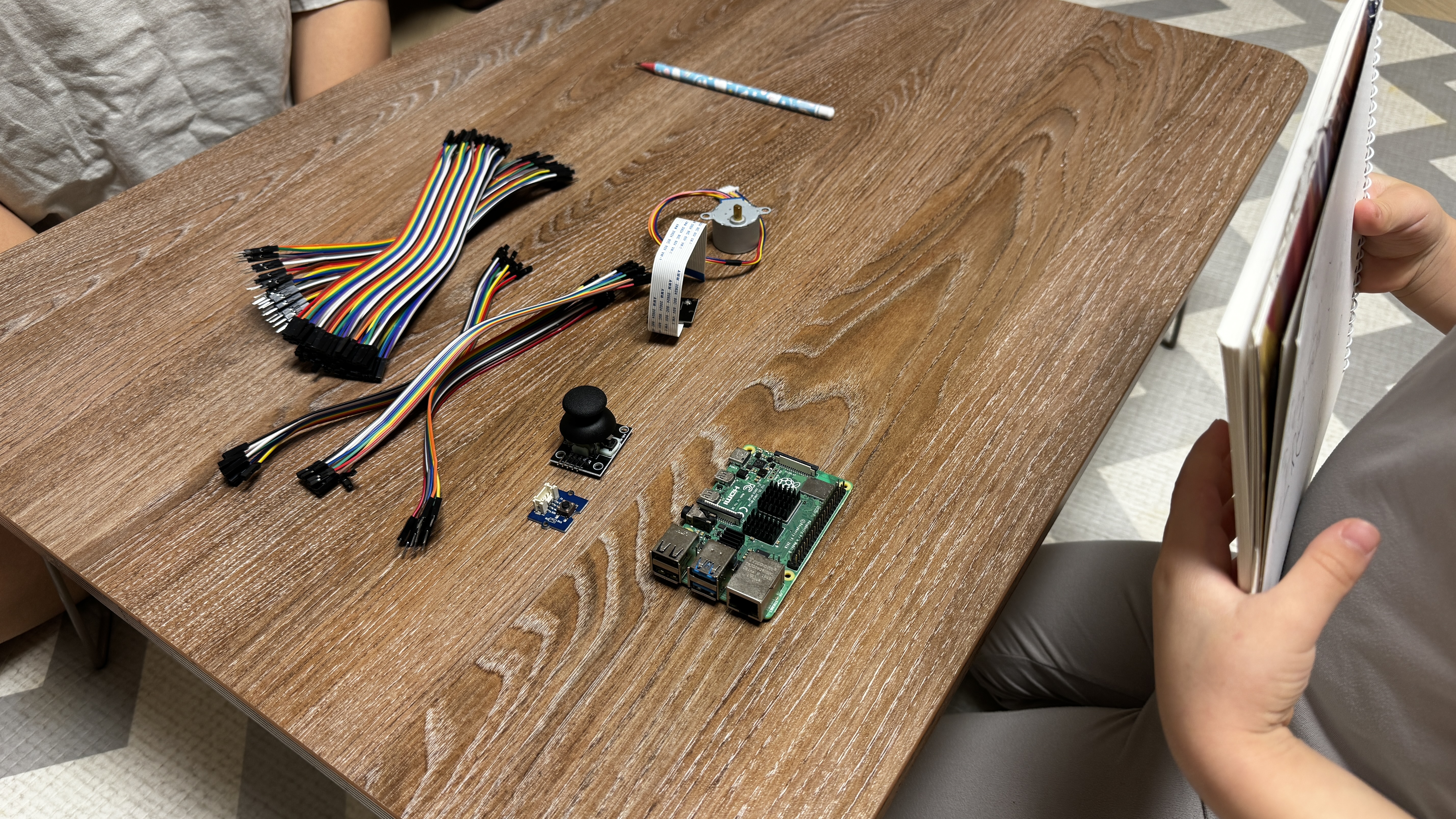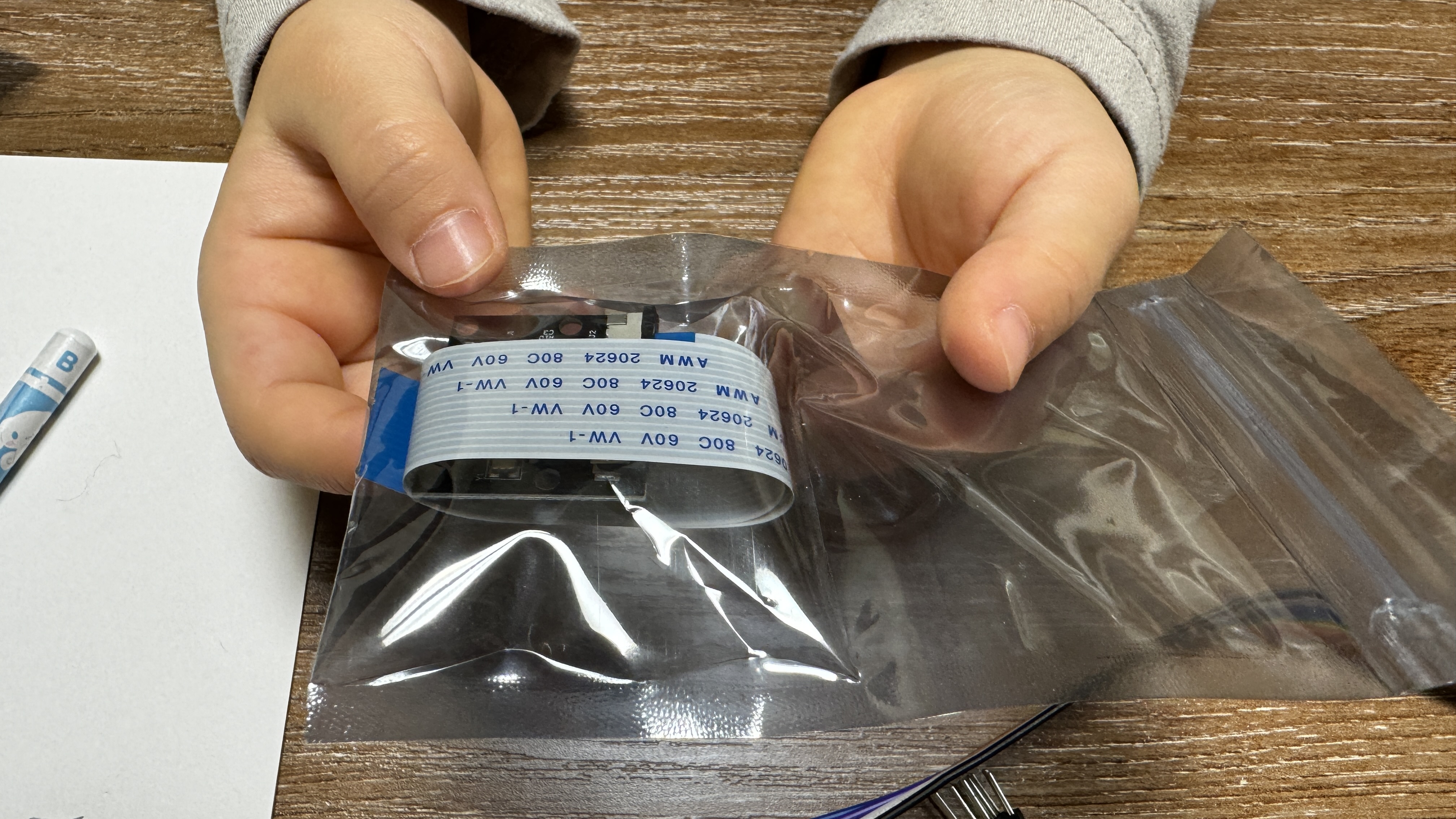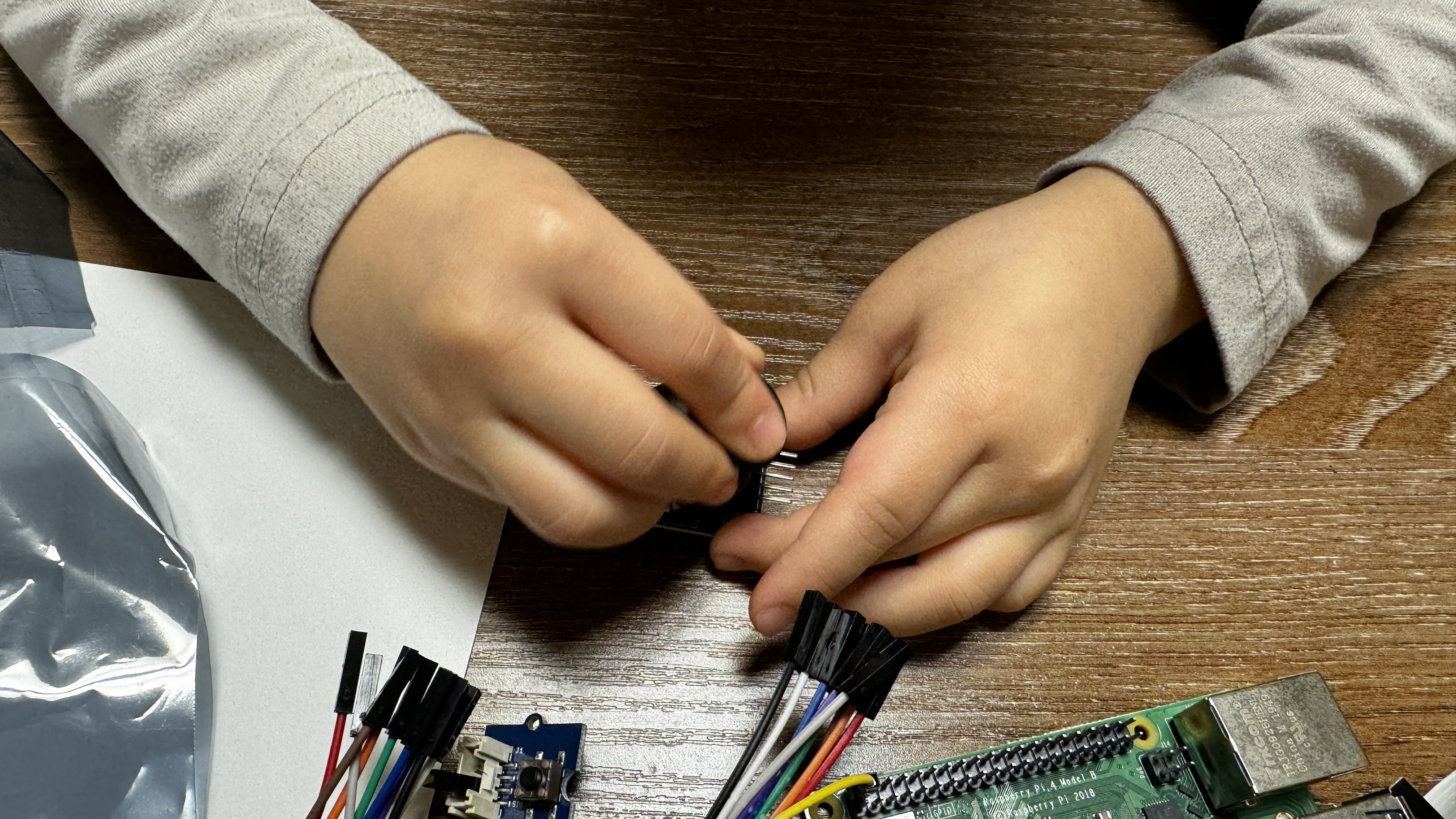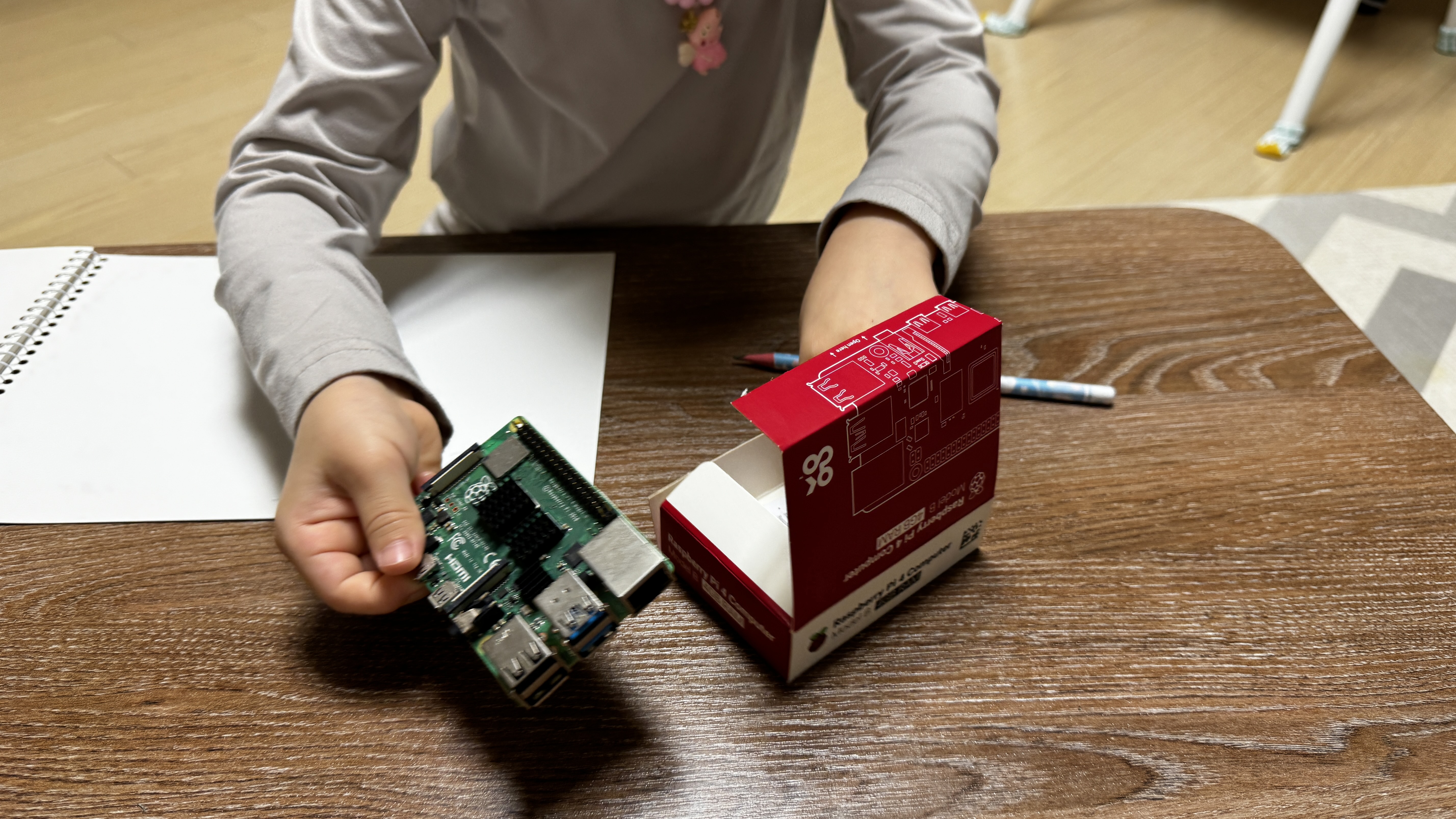 스스로 박스를 열어 Raspberry Pi 본체와 이것저것 부품들을 관찰하는 시간을 갖습니다.